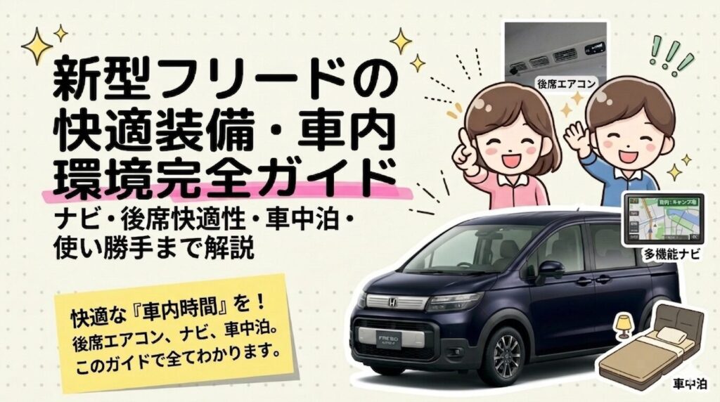 この記事では、新型フリードの快適装備・車内環境・使い勝手を「ナビ・車内装備・後席快適性・シートアレンジ・積載と趣味活用」の視点からわかりやすく整理して解説します。詳しい内容は個別記事にもまとめているので、まずはこの記事で全体像をつかんでください。