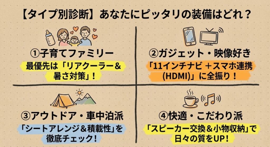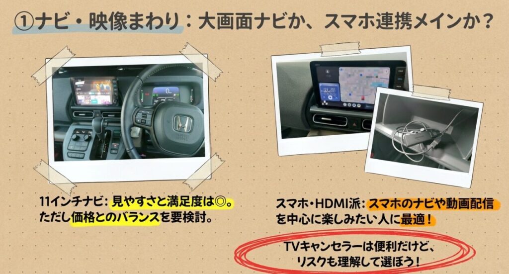 実際には、使う頻度が高い装備だけを選んだほうが満足度は高くなりやすいです。ナビ、HDMI、TVキャンセラーなども、自分の使い方に合うかで判断することが大切です。