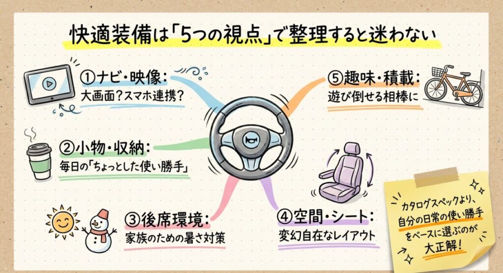 特に見ておきたいのは、ナビ・映像まわり、車内の小物装備、後席の温度環境、シートアレンジ、積載や趣味との相性の5つです。この5つを順番に見ていくと、自分に必要な装備が見えやすくなります。