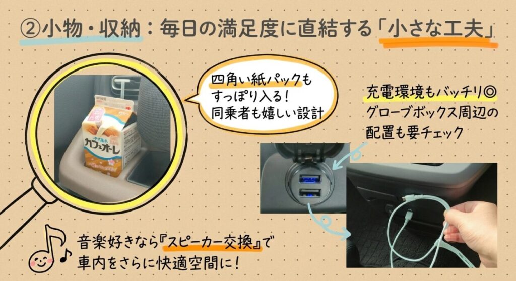 運転席だけでなく同乗者も使いやすいかどうか、置きやすい位置かどうかは、使ってみると意外と気になる部分です。こうした細かな装備も、毎日使うからこそ重要です。