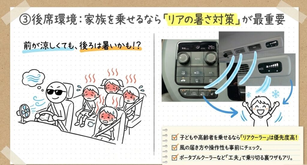 後席快適性を重視するなら、単純に有無だけでなく、どれくらい風が届くか、暑さ対策をどう組み合わせるかも大切です。