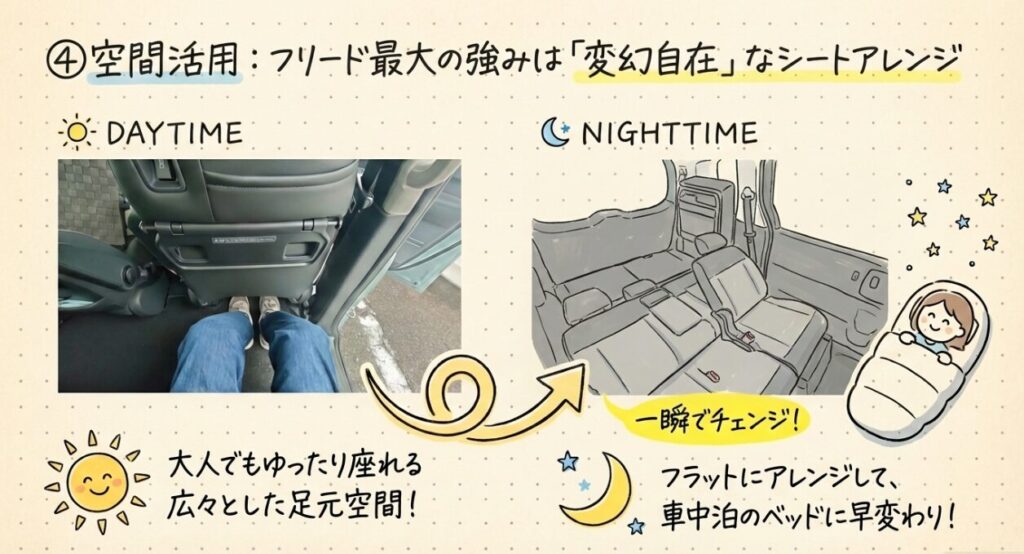 シートアレンジと車中泊のしやすさはフリードの強み