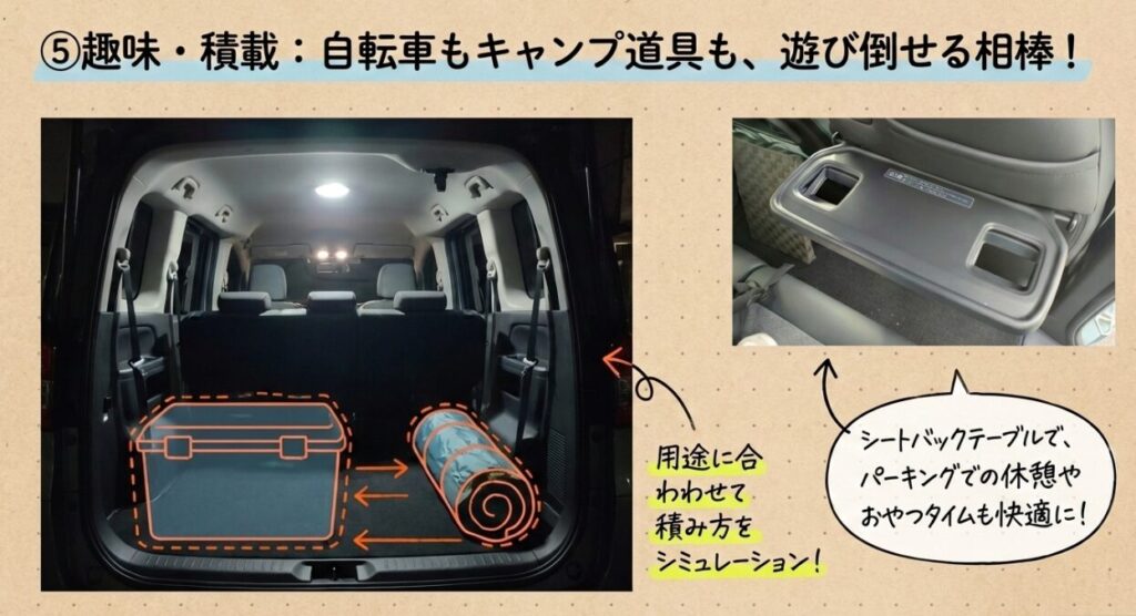 完全に広いとはいえなくても、工夫次第で使いやすくなる部分もあります。普段使いだけでなく、レジャーでどう使いたいかまで考えると選びやすくなります。
