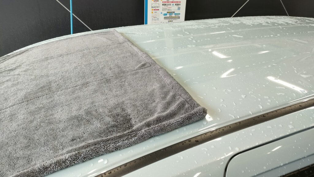 私がよくやるのは、ボンネットやルーフにタオルをふわっと置いて、端を持って引くやり方。力を入れるより、タオルに吸わせるイメージです。